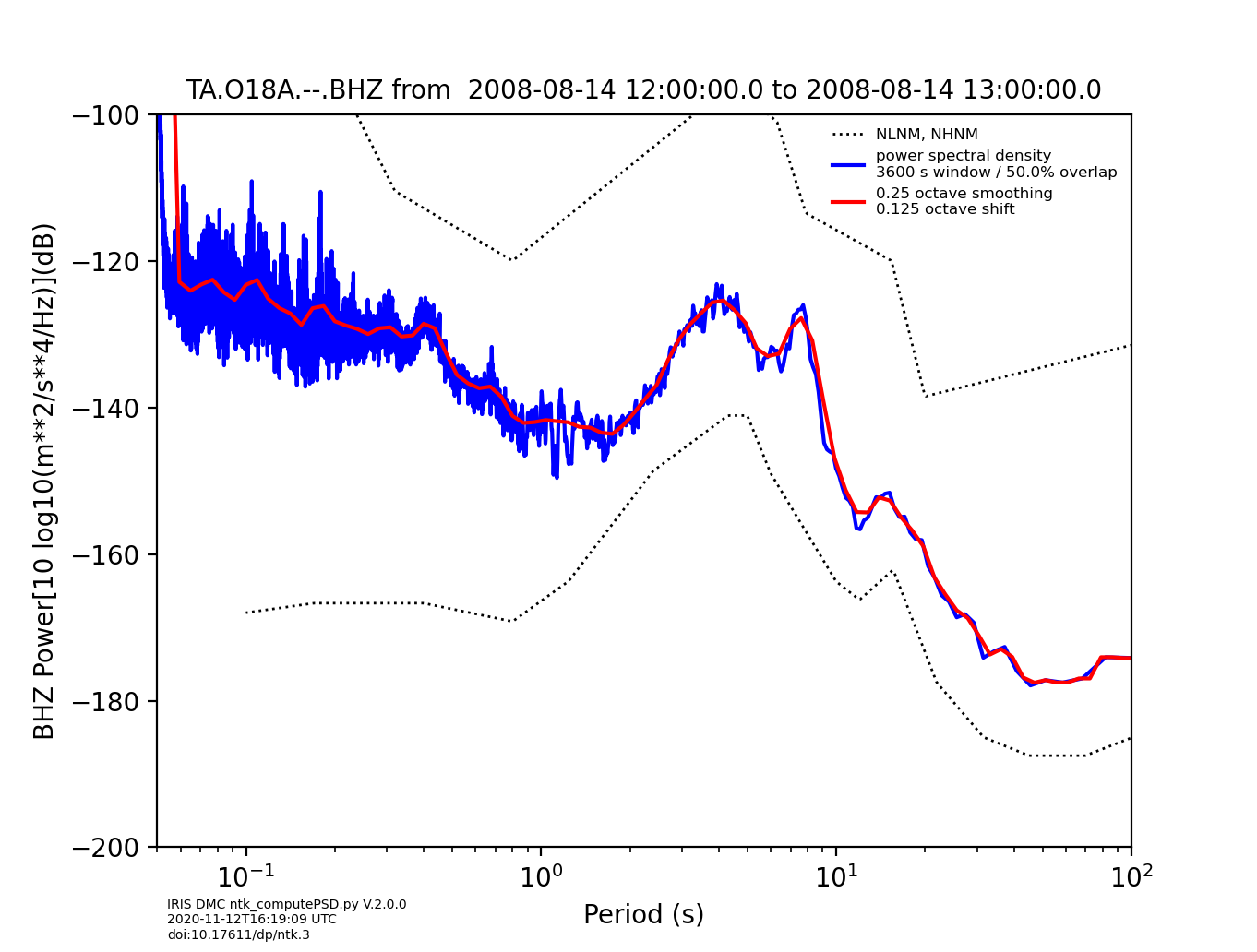 python bin/ntk_computePSD.py param=computePSD net=TA sta=O18A loc=DASH chan=BHZ start=2008-08-14T12:00:00 end=2008-08-14T13:30:00 xtype=period sw_width=1 plot=1