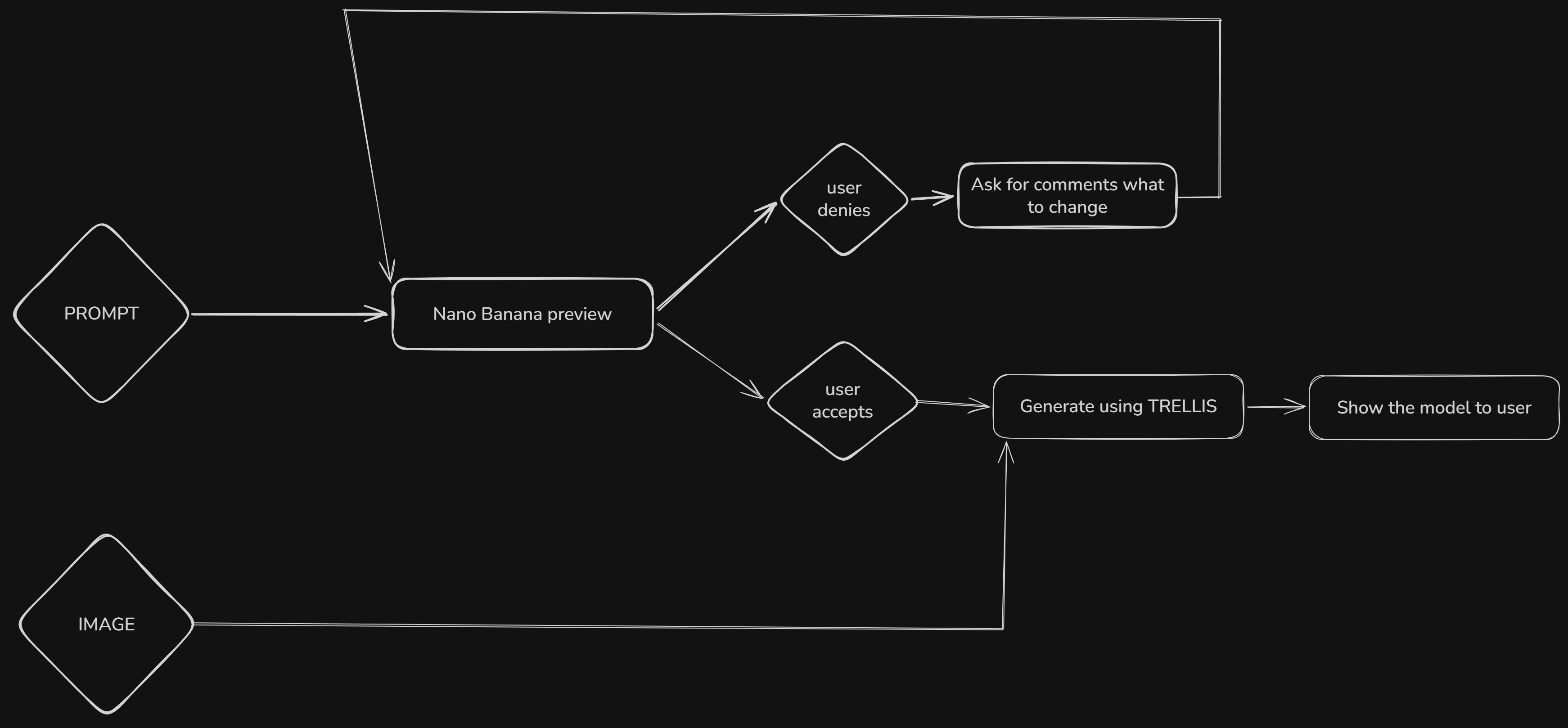 This is simple web app that allows you to generate 3D models from text prompt or image. It uses Google Nano Banana pro to generate the base image that you need to approve or deny and then creates this 3D model using the microsoft/TRELLIS model (hosted on fal.ai)