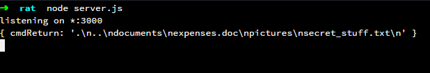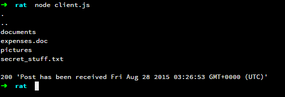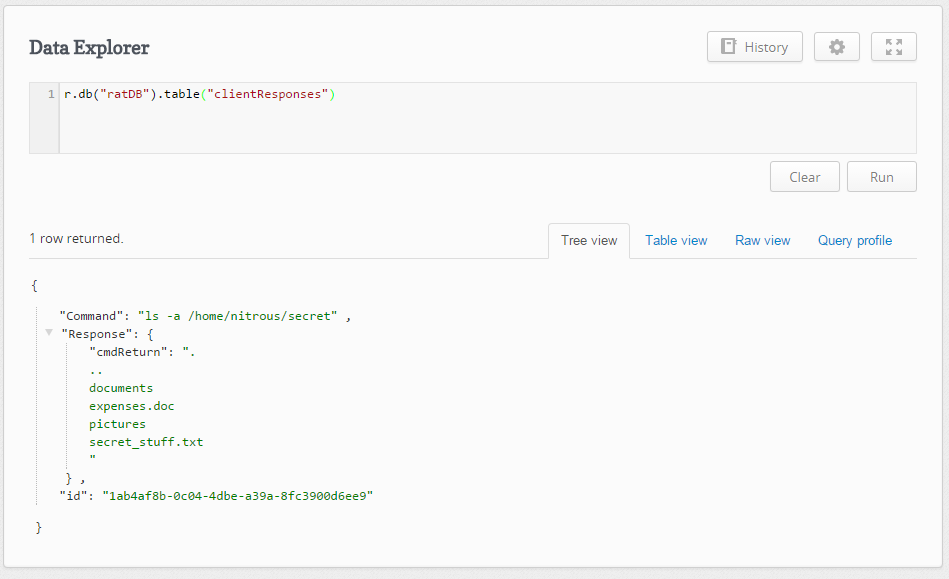 Then I take the response of the exec() and post it back to the server using the request module where it is received and stored in a RethinkDB database called ratDB under a table called clientResponses.