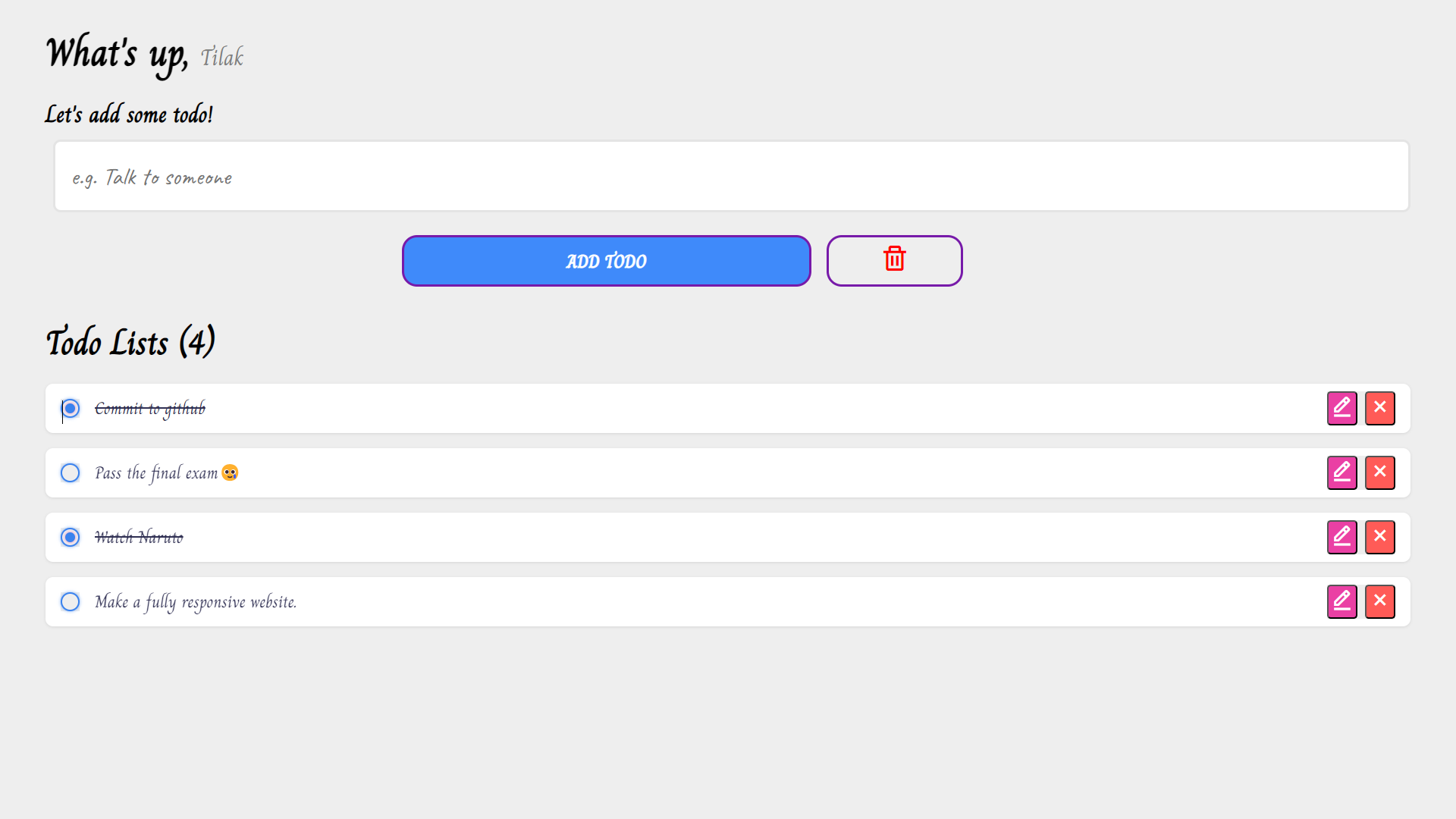 Delete Todo: Users can remove a todo item by clicking the delete button (trash icon) next to the item. This will remove the item from the todo list.