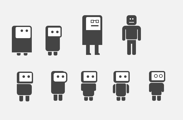 While Brad started developing the mechanics, I solicited the help of my son, to help me design the character. What we ended up going with in the final game is pretty darn close to what we first designed. It went through some variations, but in the end we kept coming back to our robot-looking character. In my mind I could see his legs moving and his head bobbing. He originally had rounded corners, but that ended up making the svg output more complicated, so in the end we ditched them.