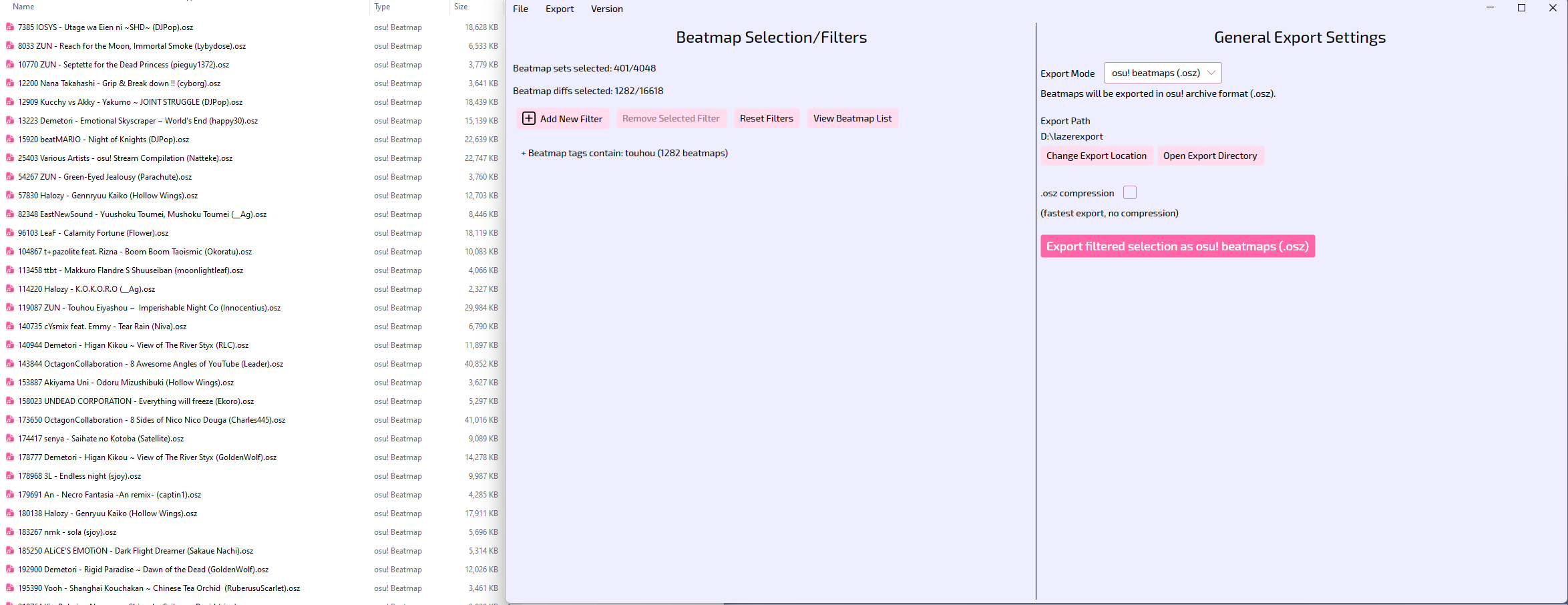 BeatmapExporter is a program/tool that can mass-export your osu! beatmap library from the modern osu! Lazer storage format.