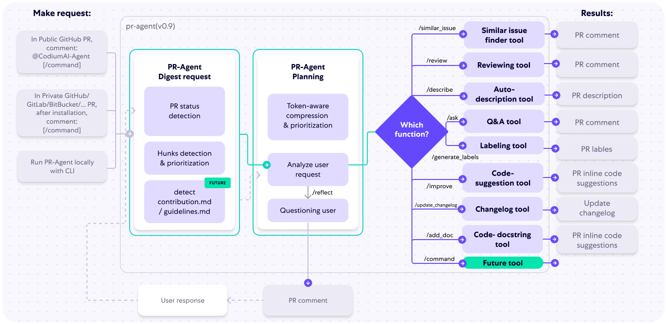 The following diagram illustrates PR-Agent tools and their flow:
