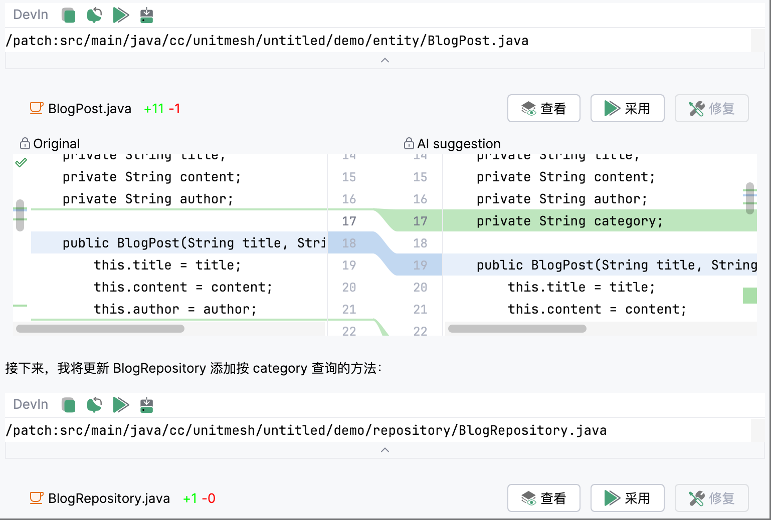 - Custom specification of prompt. For example, Controller, Service, Repository, Model, etc.