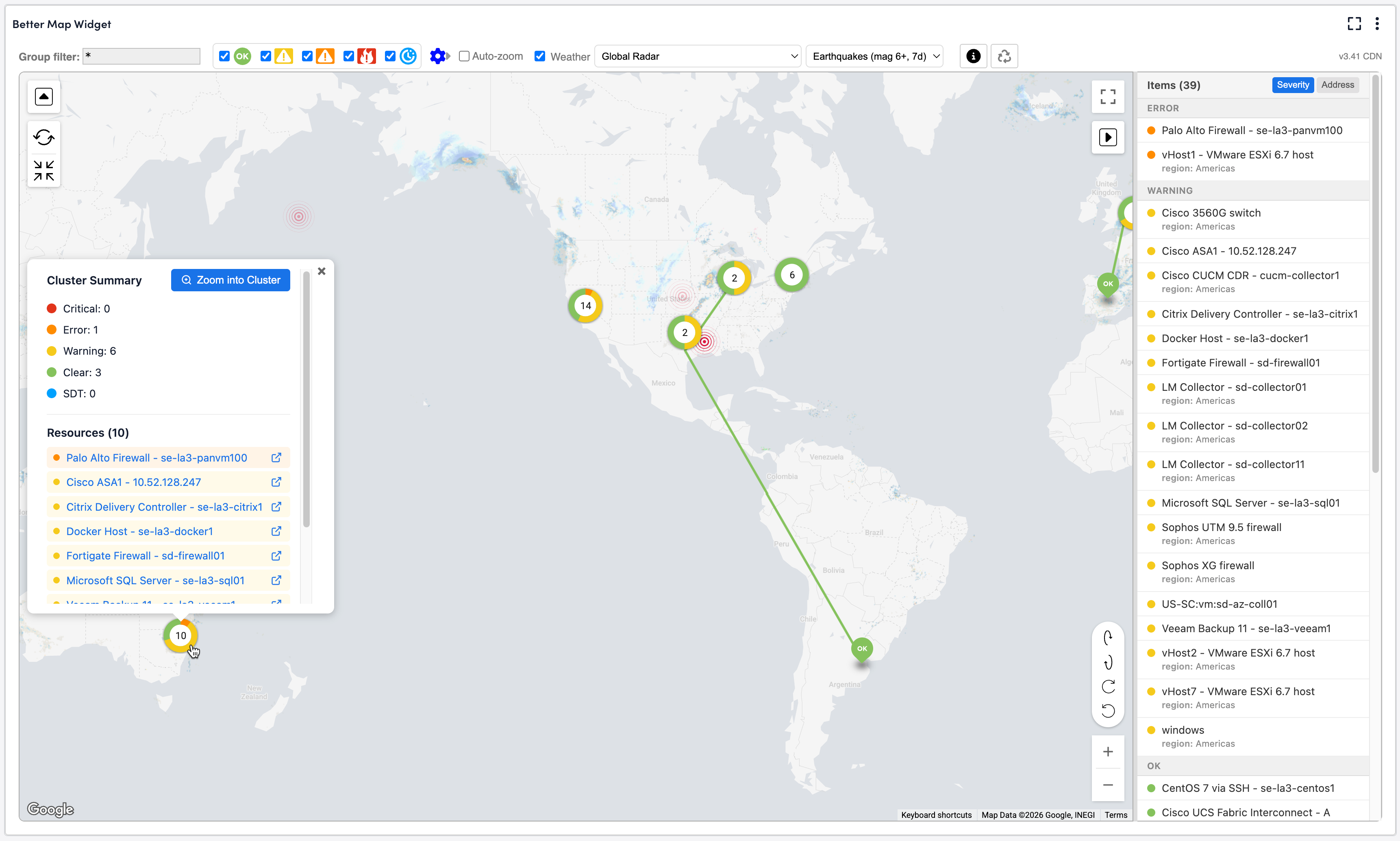 Note that by default the zoom level of the map will not auto-reset on refreshes to ensure that all markers are visible. Enabling that feature can be very useful when filtering on specific severities and new matching items appear, especially when displayed on overhead monitors.