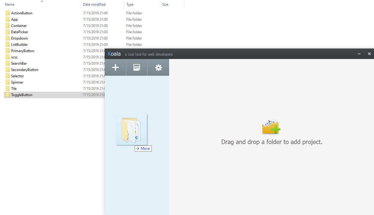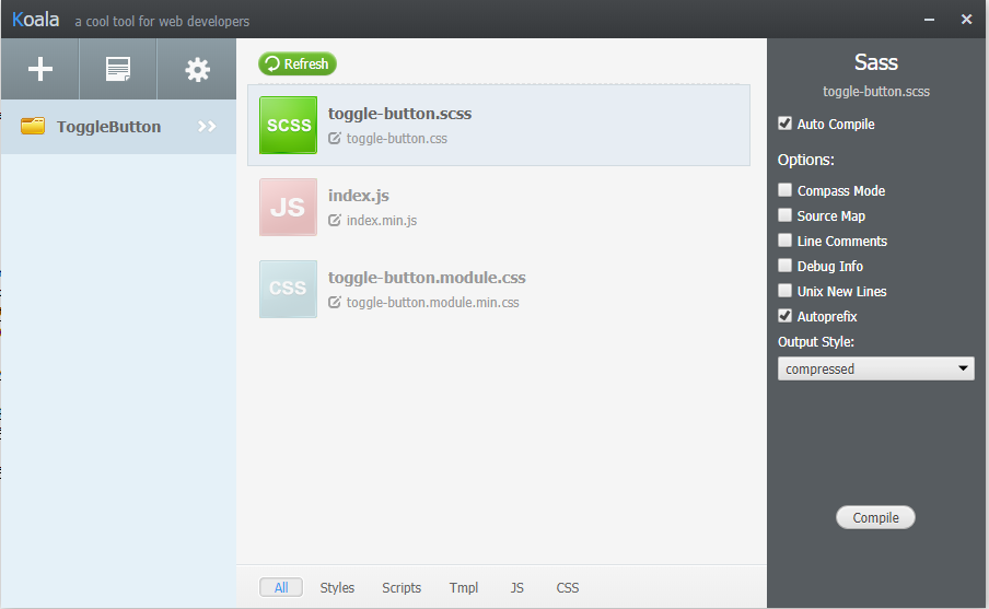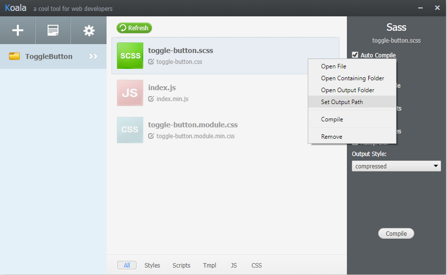 Open the folder in the app and click on the .scss file to set up the compiler on the right sidebar like so: