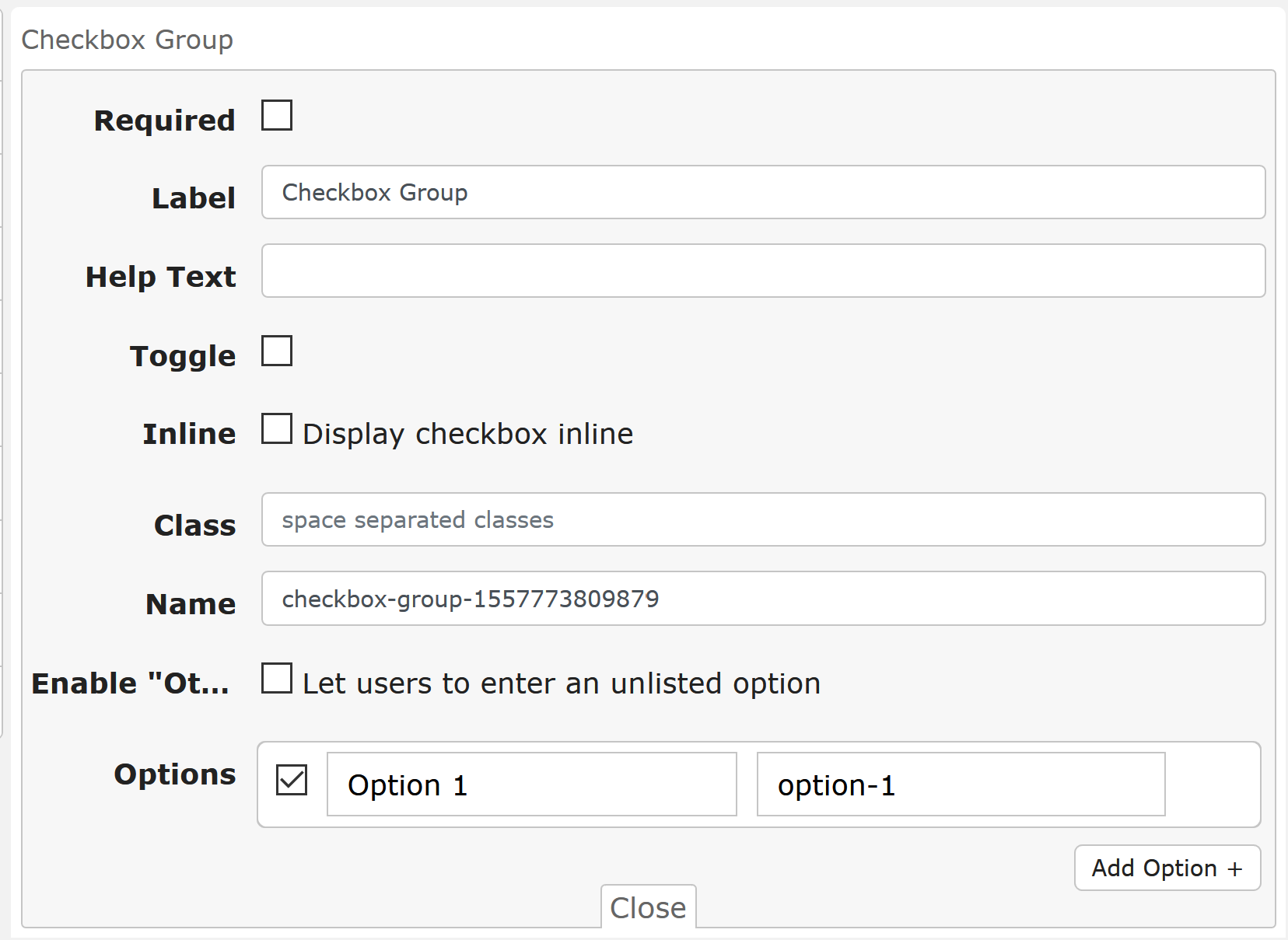 | Help Text | Displays a question mark next to the field label. When you move with your mouse cursor, the help text is displayed inside a tooltip | no |