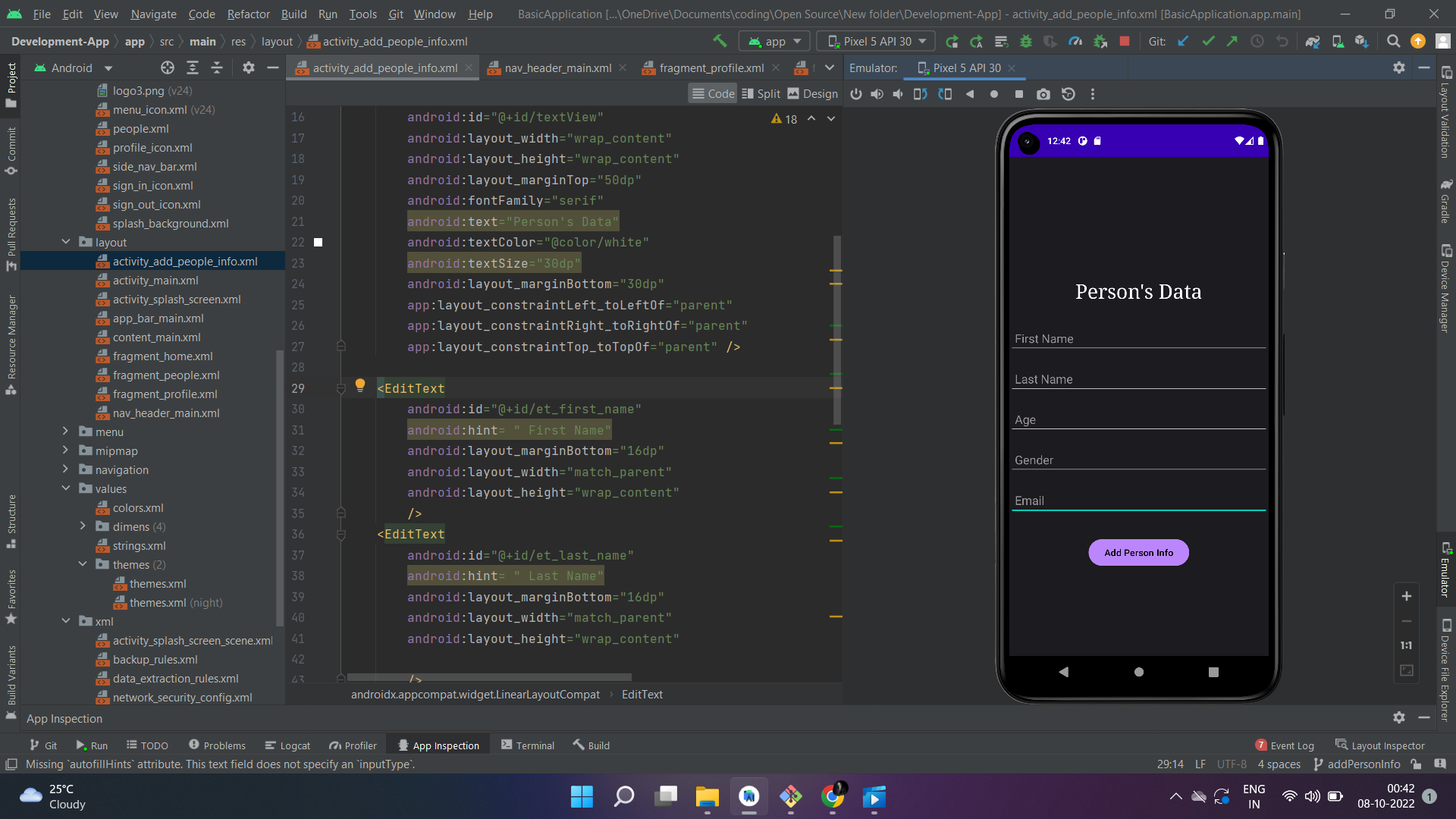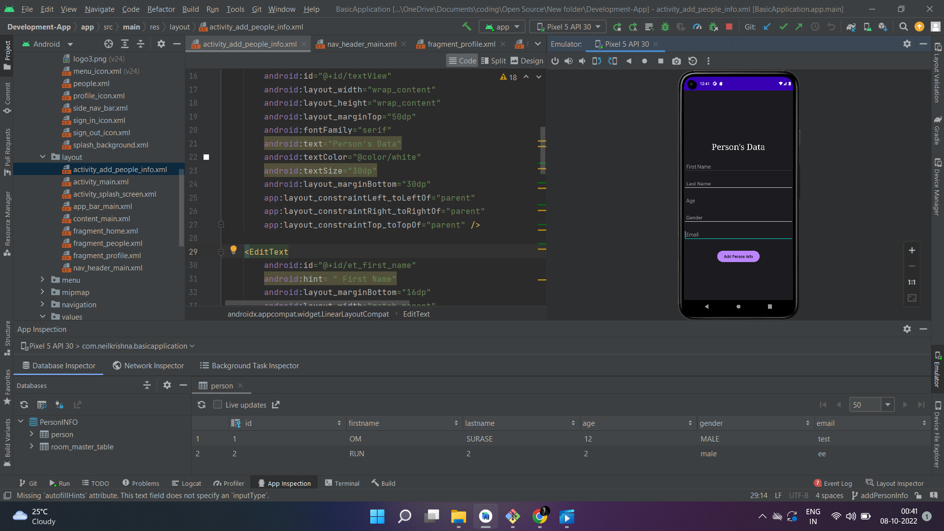 Programmed add person floating action button, on clicking add person button new activity is launched on which the user has to upload all the details of the person. A person's info is written in the database only when all the fields are filled. only function for inserting a person's information into the database is implemented.