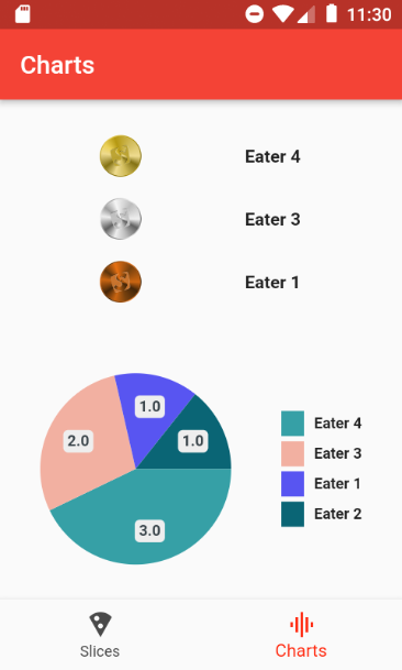 Quando há jogadores, é possível visualizar o "pódio" dos maiores comilões! Além de um gráfico mostrando a partição dos pedaços comidos pelo grupo todo.