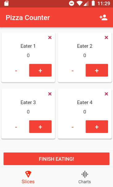 Quando há jogadores, é possível visualiza-los a partir de quadradinhos. Nos quadrados, podemos adicionar ou remover pedaços de pizza, e na AppBar, é possível adicionar outros usuários.
