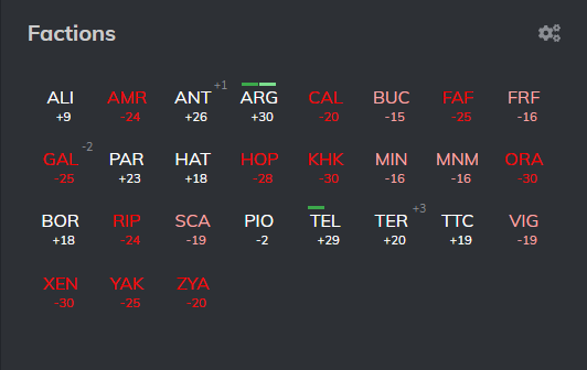 When a faction relation changes, its name will blink and the recent relation change value will be displayed in the top right of a faction name.