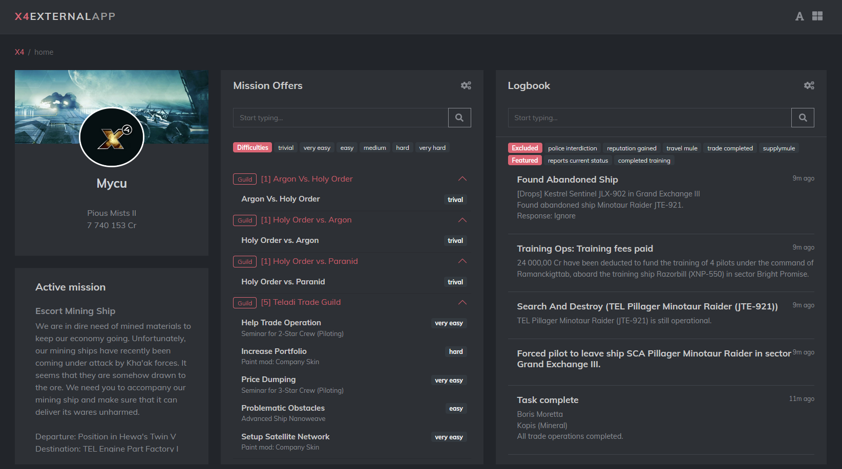 Shows real-time logbook entries, mission offers, currently active mission details and player information.