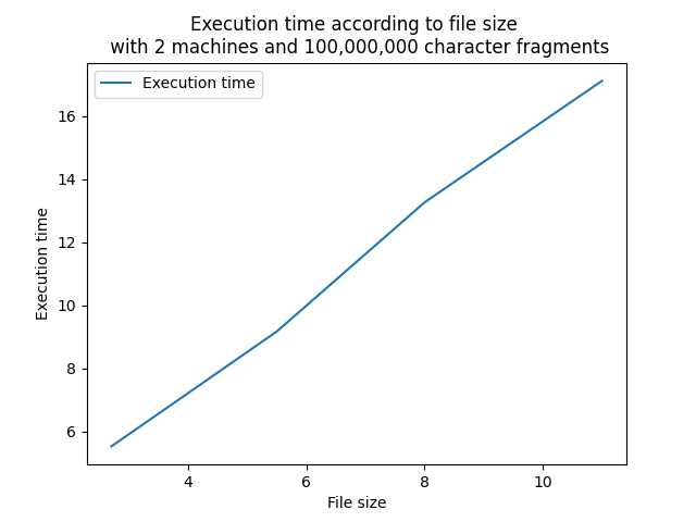 This graphical representation examines the variation in the size of the fragments sent for processing to the machines. It can be observed that the larger the size of the fragments, the faster the execution. This can be interpreted by considering that increasing the size of the fragments leads to a decrease in the number of threads on the different machines, thereby freeing up more resources. However, it is interesting to note that simply creating more threads of smaller size does not necessarily accelerate execution. It is crucial to find an optimal balance between the number of threads and the size of the fragments.