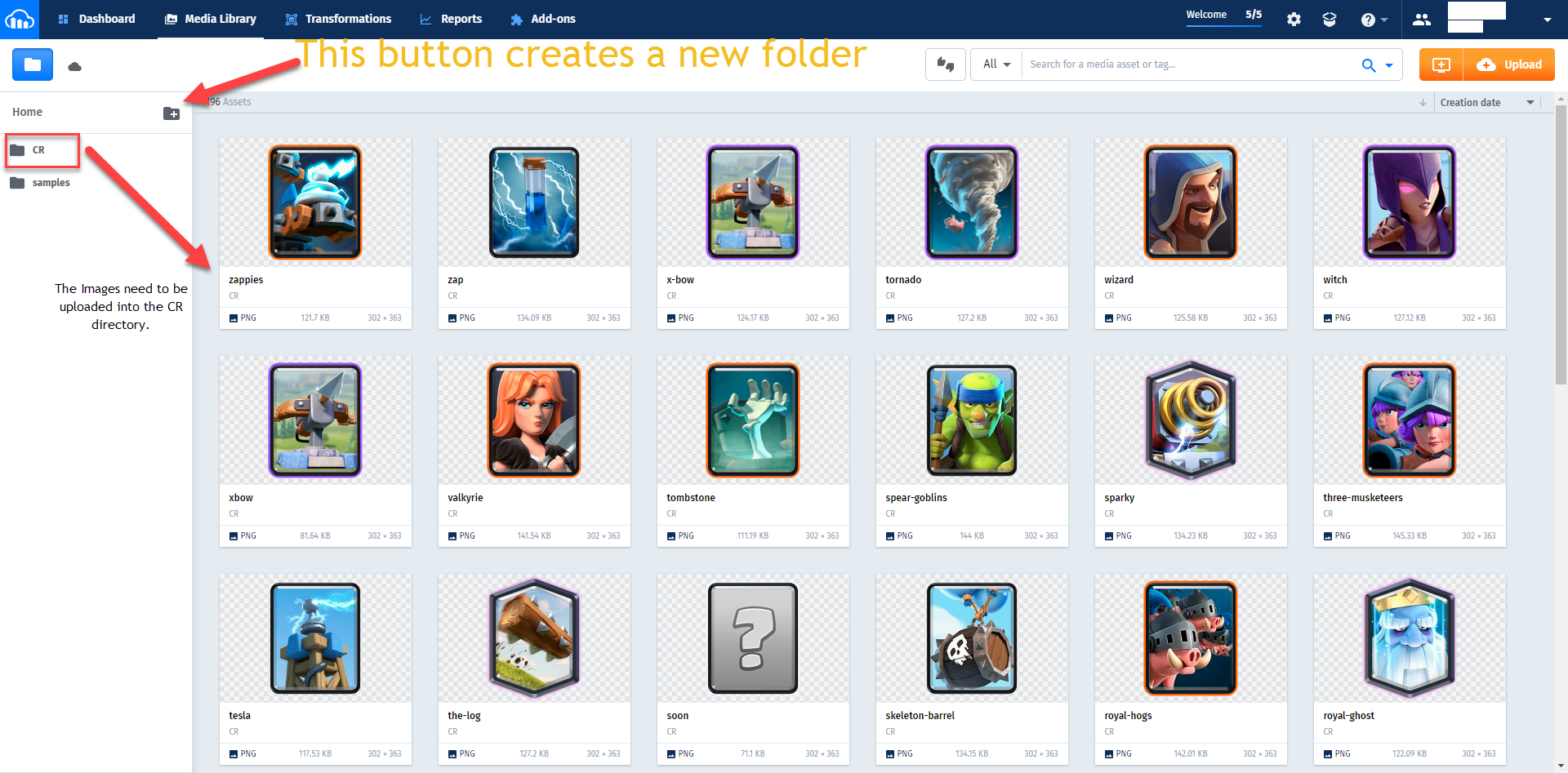 8. Upload the contents of the "cards" folder to your CR folder in Cloudinary.
