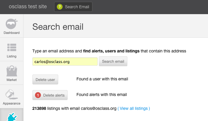 This plugin allows site administrators to find all the information associated to an email address. Just by typing the email address on the admin panel, admins will be able find all the information related to it (existing user or not, number of posted ads, associated alerts,etc.) This plugin will help you delete some of the information associated to those email addresses.