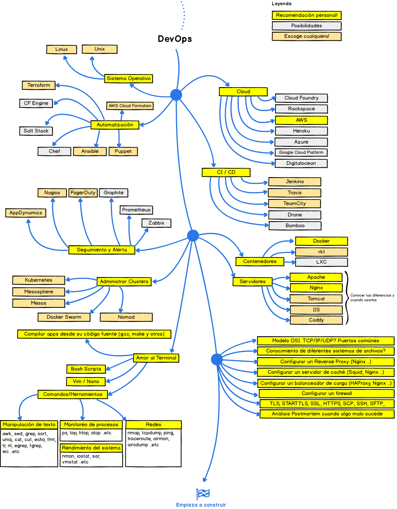 Abajo encontrarás un conjunto de diagramas que muestran los caminos que puedes tomar y las tecnologías que desearas adoptar para ser un desarrollador frontend, backend o devops. Hice estos diagramas para un profesor antiguo que tuve, el deseaba compartirle algo a sus estudiantes para darles una perspectiva.
