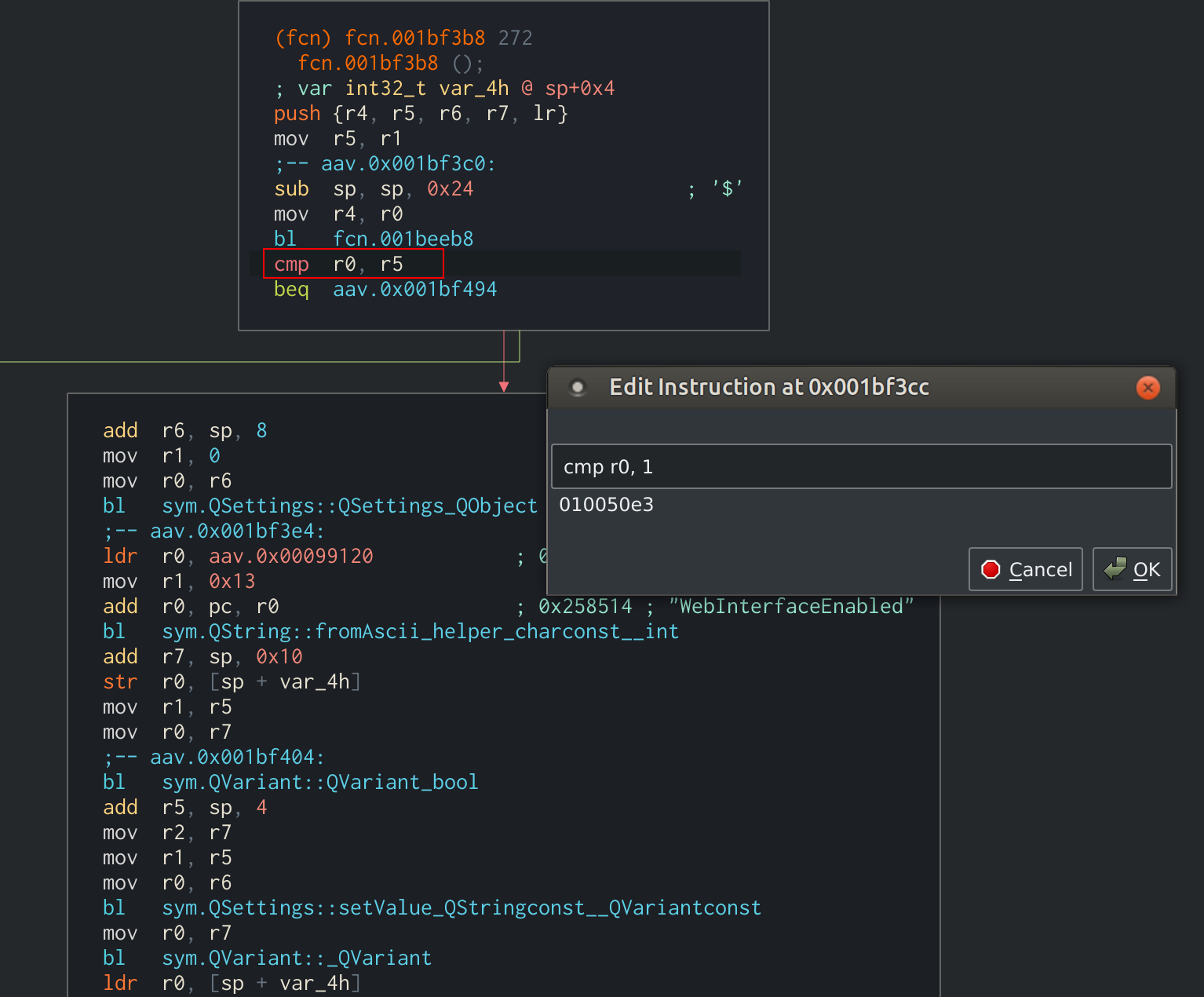 In our example, the functions fcn.001beed8 and fcn.001bf3ec reference this string. We must now inspect these functions and determine which one is responsible for setting the WebInterface.