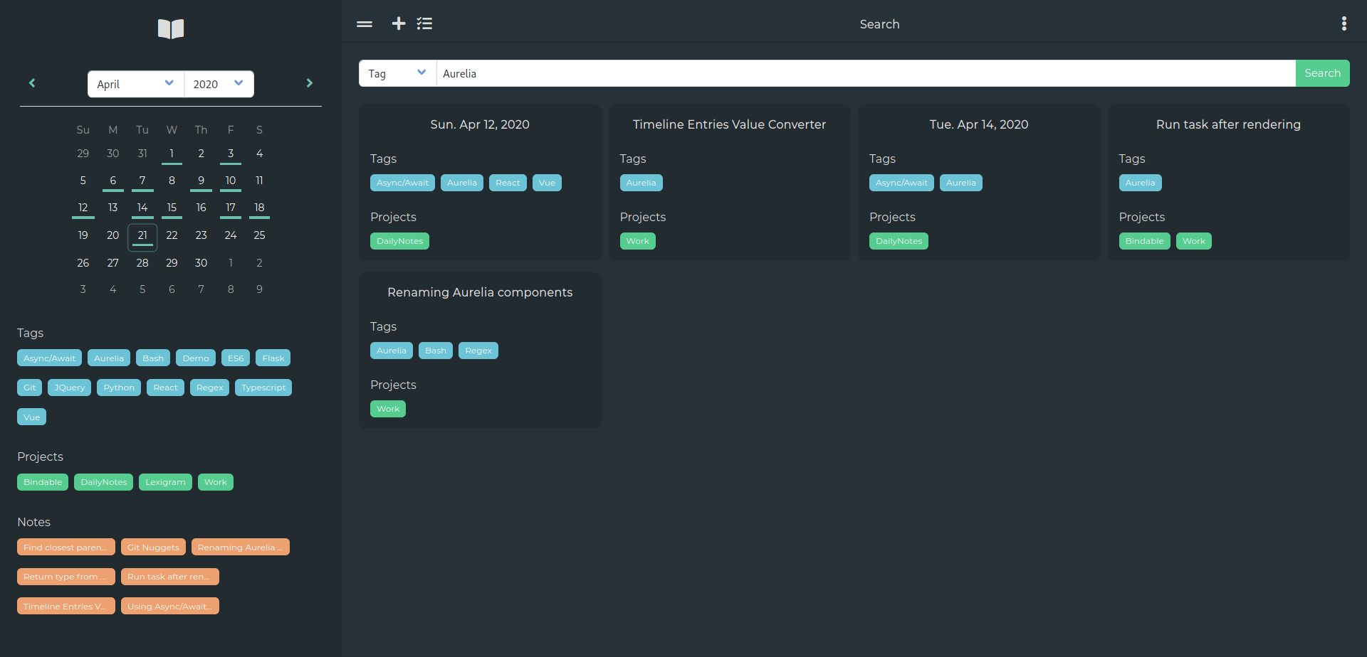 Since I had the need for keeping track of to-dos throughout the day, regular Markdown didn't work for me since it doesn't natively support tasks. So as an alternative I'm using Github Flavored Markdown (GFM). I really wanted it to feel like an actual text editor and not just a textbox, so I decided to use CodeMirror to handle all the input. Fira Code is used to provide font ligatures. Some other nice features include code highlighting, text/code folding, and a task list where you can toggle the status of any task from any date or note.