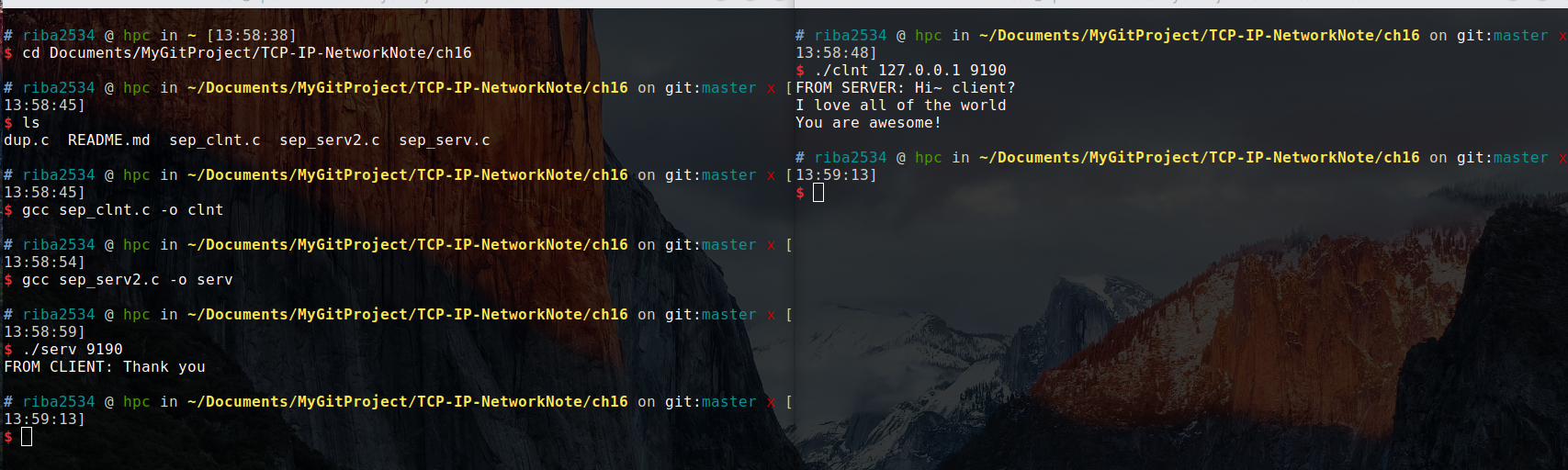 ./hclient 127.0.0.1 9190运行的时候,首先再 9190 端口启动服务,然后 heserver 就会一直等待客户端进行响应,当客户端监听位于本地的 IP 为 127.0.0.1 的地址的9190端口时,客户端就会收到服务端的回应,输出Hello World!