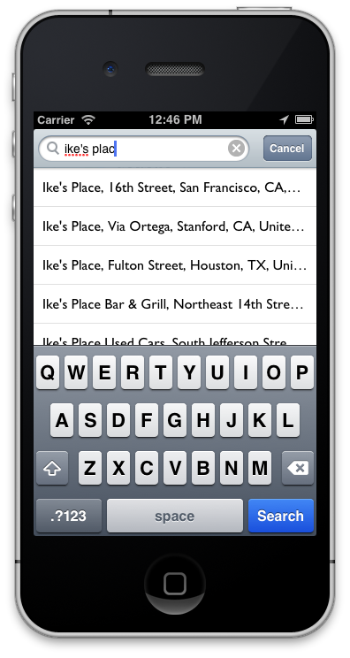}];If you need to update the query (for instance, as the user types), simply update the appropriate properties and call -fetchPlaces again. Any outstanding requests will automatically be cancelled and a new request with the updated properties will be issued.