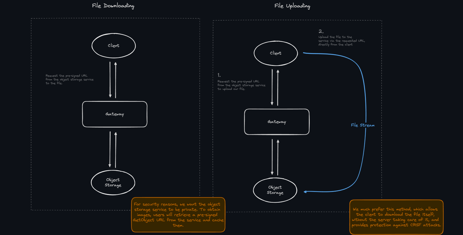 - File Uploading: For uploads, clients use a presigned URL to send files directly to object storage, enhancing security and performance.