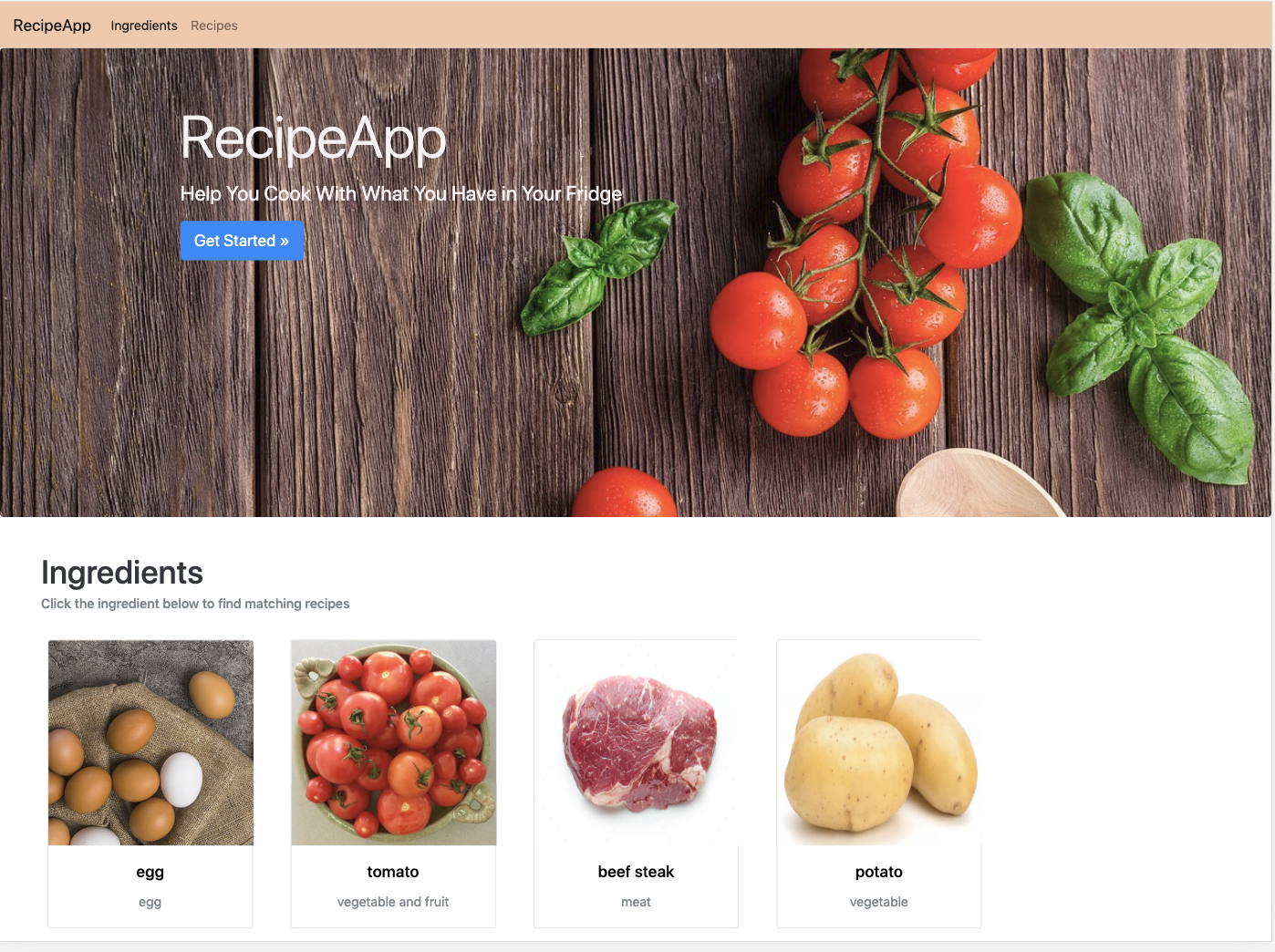 Recipe App is a django web app that allow user to search recipes by ingredients. There are two ways to search recipes. 1. On home page(ingredient page), user can select one ingredient to search recipes by clicking on the ingredient card. 2. On recipes page, user can search recipes by input multiple ingredients' name.