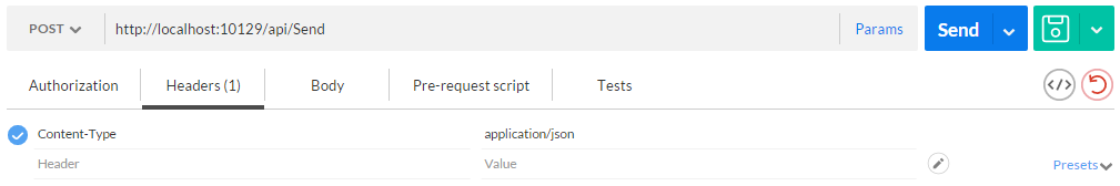 - URI should be the website address + /api/Send/ (Ex: http://localhost:10129/api/Send/)
