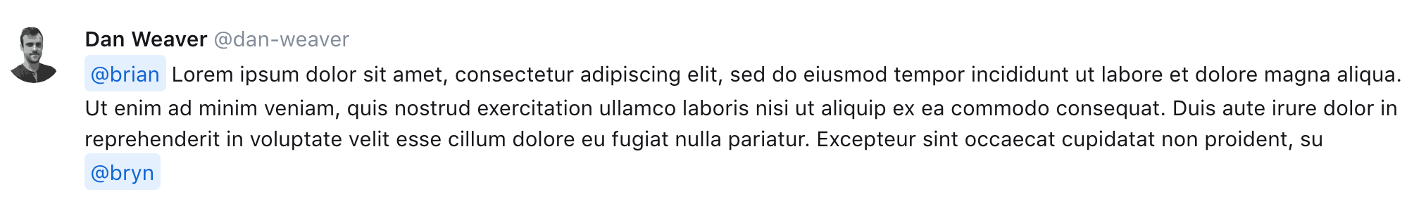 Hey @mxstbr what's up?and expect it to mention @mxstbr—it won't be counted as a mention if I don't wait for the search to complete and then click it, which is annoying. I'd much rather it automatically links/mentions whatever I type (like it does now), but also gives me suggestions if I'm not sure how to spell a certain name. (not sure this can be fixed while using the plugin?)