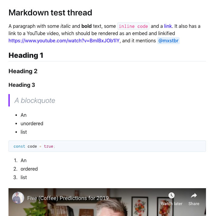 Here is what the test file renders right now (yes, embeds are appended at the end instead of the middle... that's a bug):
