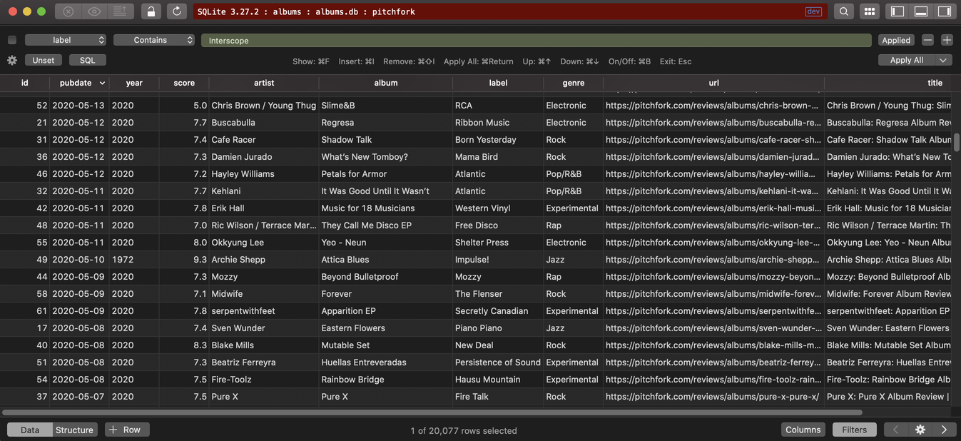 - The script parses all Pitchfork's album reviews. Yes, that's right. There are album reviews dating back from 1999... And they will be parsed too. As of today (May 2020) there are 1,876 published review pages, amounting to 20,141 unique album reviews.