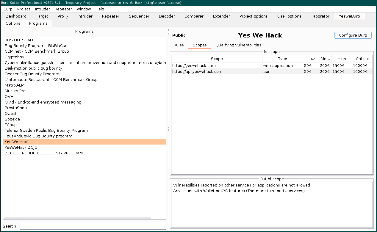 YesWeBurp also help you to instantly configure Burp according to the program rules.