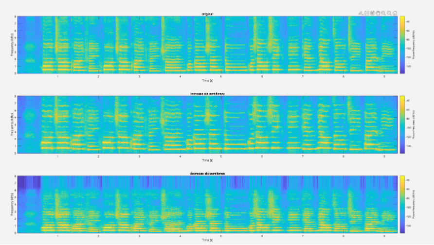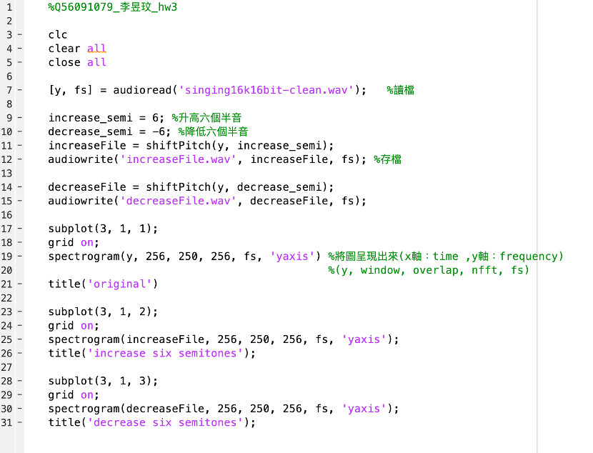 DSP Shift Pitch tags: NCKU DSP python Environment macOS python3 matlab Requirement 將原音檔提高六個半音及降低六個半音,並以spectrogram輸出圖片做比較。 Overview Fig(1) spectrogram 使用matlab內建函式 shiftPitch 以及 spectrogram。 Fig(1)由上到下分別為原始音檔、提高六度、降低六度之圖形。橫軸為time、縱軸為Frequency。可以觀察到他們間距的緊密度,越低緊密度越高,反之越鬆散。
